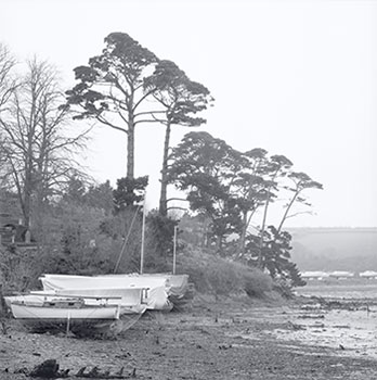 #1523 Pines, Grave Stones, Sailboats, Low Tide at Roseland Estuary, Morning Under a Grey Sky, March 17, 1997, AM, Cornwall, England