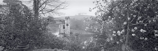 #1525 St. Just's with Clocktower and Magnolia Blossoms, Roseland Under a Grey Morning Sky, March 17, 1997, 8:45 AM, Cornwall, England