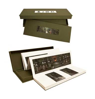 The book is printed and crafted in our studio using the Epson 9880 using Epson K-3 inks with Vivid Magenta on Hahnemuhle Photo Rag 308. After printing we spray the prints with 3 coats of Hahnemuhle Protective Spray. The accordion books are fabricated using 100% cotton rag mat board for the construction of the binding board and clam shell boxes. The adhesives are Bienfang Color Mount and PVA glue. The mat board is covered a book binding fabric produced in Japan by World Cloth Company Limited.