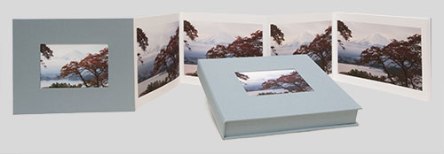The book is printed and crafted in our studio using the Epson 9880 using Epson K - 3 inks with Vivid Magenta on Hahnemuhle Photo Rag 308. The accordion book components are fabricated using 100% rag mat board for the book’s binding boards and clamshell box. The adhesives are Bienfang Color Mount and PVA glue. The mat board is covered with IRIS a book binding fabric