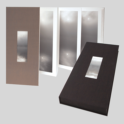 The book is printed and crafted in our studio using the Epson 9880 using Epson K - 3 inks with Vivid Magenta on Hahnemuhle Photo Rag 308. The accordion book components are fabricated using 100% rag mat board for the binding boards and clam shell. The adhesives are Bienfang Color Mount and PVA glue. The mat board is covered with"Mohair" a book binding fabric produced by World Cloth Co. Ltd. Japan.