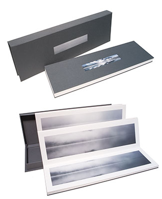 The book is printed and crafted in our studio using the Epson 9880 using Epson K - 3 inks with Vivid Magenta on Hahnemuhle Photo Rag 308. The accordion book components are fabricated using 100% rag mat board for the book’s binding boards and clamshell box. The adhesives are Bienfang Color Mount and PVA glue. The mat board is covered with a book binding fabric produced by World Cloth Co. Ltd. Japan.