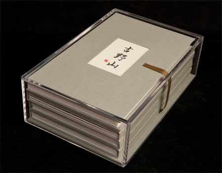 The limited edition collection is printed in an addition of nine copies and two artist proofs. Presented in an acrylic box holding the introductory guide and three folios each with a double sided six panel screens. A window in the cover of the introductory guide frames original calligraphy "Yoshinoyama" The guide is an accordion book contains 5 prints and cropped selections from the photographs.